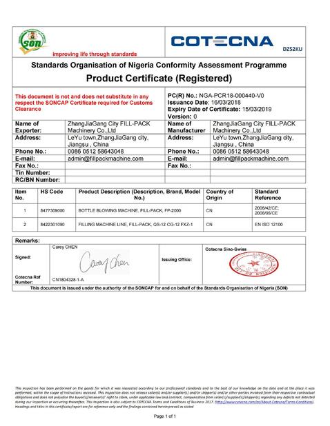 | Standar: | Shipment Conformity certificate |