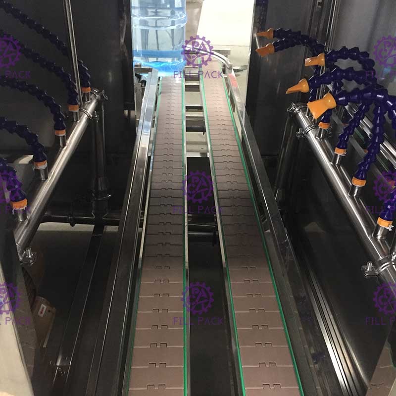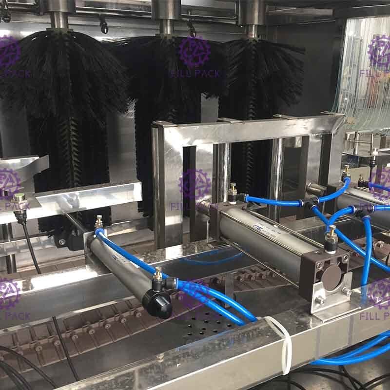 Mesin pengisian air botol 5 galon dapat dibagi menjadi 3 langkah: mencuci, mengisi dan menutup, total 36 stasiun kerja,proses kerja sebagai berikut: