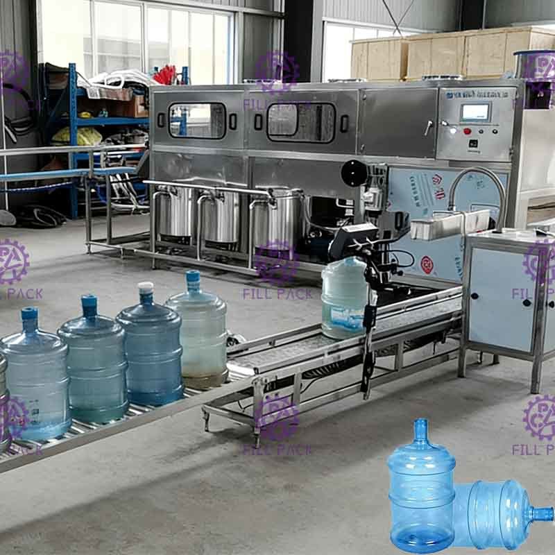 Mesin pengisian botol air 5 galon dengan konstruksi kompak, akan menempati ruangan kecil, efisiensi kerja tinggi.