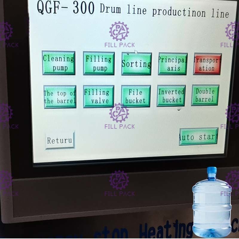 1) Atur mulut galon kosong ke dudukan galon, galon kosong akan dicuci selama situasi berdiri kepala, 4 stasiun kerja untuk memasukkan galon.